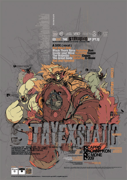 ED209 STAYEXSTATIC EP The STAYEXSTATIC EP can be bought directly from 209 for £5.00 + £1.50 for standard postage - postage will be charged at cost for Special or Recorded Delivery in the UK or overseas orders. You can also pay via PAYPAL to ed209@superexstatic.com Review from Ryan Proctor for Blues & Soul : "It's safe to say that Leicester-based producer ED209 probably spent his youth analysing the organised noise of The Bomb Squad, studying the low end theories of A Tribe Called Quest, and daydreaming about entering Ced Gee's fabled Ultra Lab. Back with the "Stayexstatic" EP, ED drops more of that rough, rugged and raw boom-bap that makes you screw your face up, adopt a b-boy stance and bang your head until your eyeballs almost fall out. A gifted manipulator of sound, ED has once again chosen the perfect group of lyricists to accompany his futuristic funk. Konny Kon pummels "Black Thorn Rose" with his semi-automatic lyricism, while Cappo demand his props over the chopped guitars of "The Majestic". "The Great Godz" finds princess of poetry C-Mone swooping down over the track's ethereal soundscape like an around-the-way angel, dodging speaker-popping bass-drops to deliver her views on the shortcomings of the modern world. Hip-Hop lives!" For information on where to send payment, contact : 209@superexstatic.com or use the message link ( Free poster (as seen on this page) inside every 12" ) |